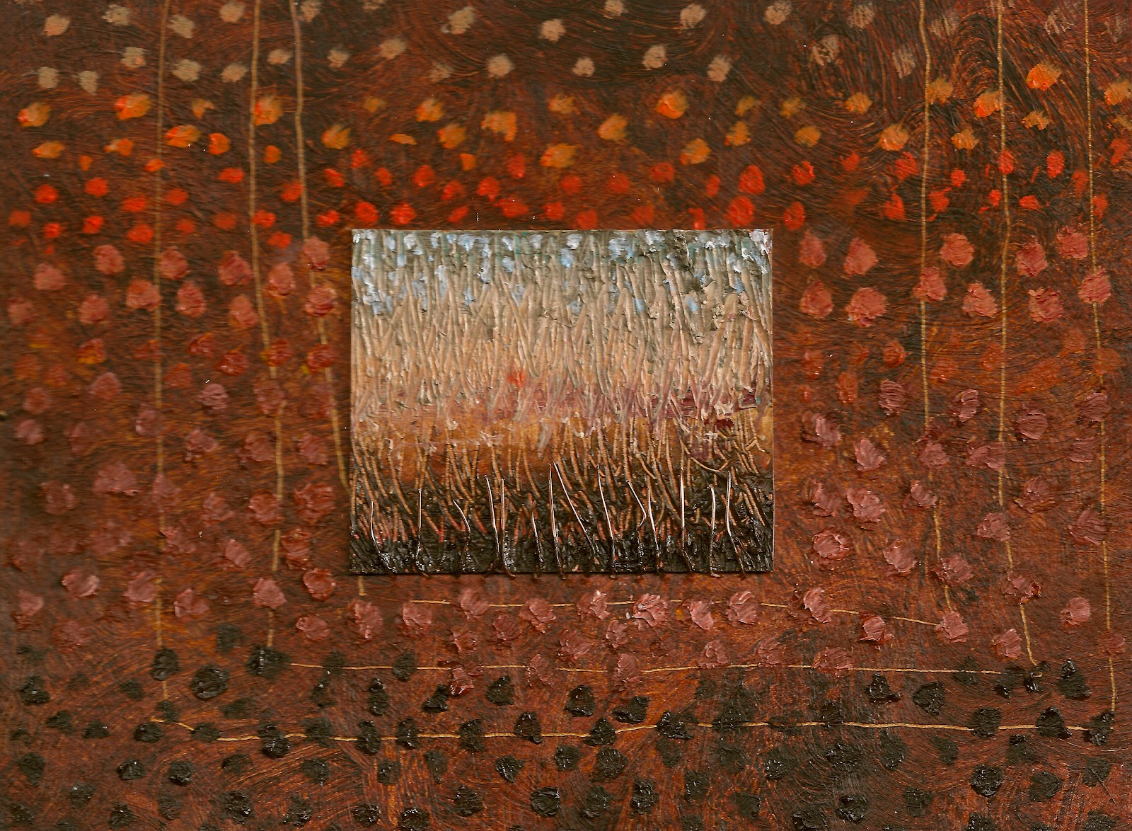 From a series of small imaginary landscapes made of metallic and oil paints, thread, and wire. For sale through my studio.